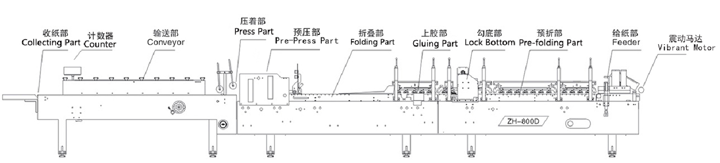 ZH-800D/900D/1000D型勾底糊盒機與ZH-800G糊盒機結構基本相同,在該機基礎上增加了三個部分: 1、上壓輪采用皮帶運行結構,使走紙更穩定。 2、在本折出紙部增加了預壓部使出紙更平整。 3、收紙部采用等待收紙功能,電機可以單獨調速,使收紙更合理。