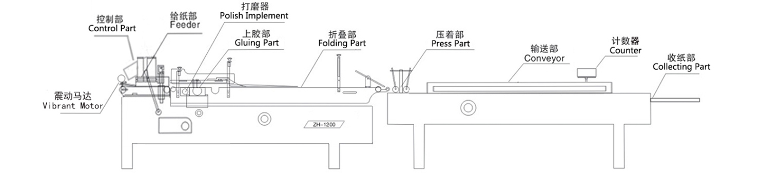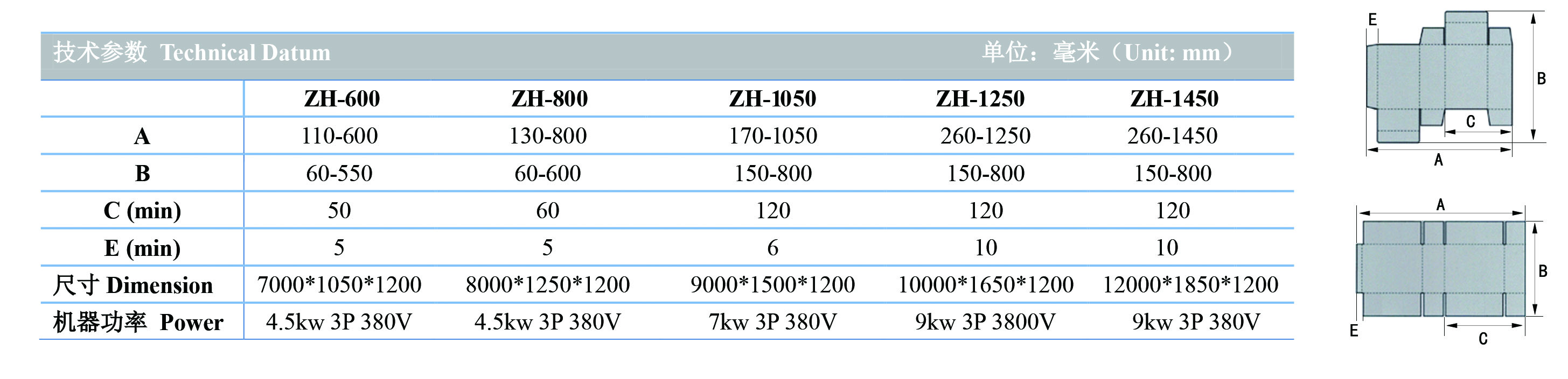 ZH-1050/1250/1450型糊盒機專為大型邊貼盒而設計制造的,純進紙寬度達一米,超長的本折部可大大降低糊盒喇叭口的出現。 本折部上皮帶還可以單獨調速,針對E瓦楞細瓦楞的喇叭口也起到一定的作用,因此是生產大型紙盒包裝的理想設備。