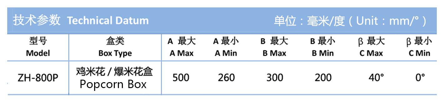 ZH-800J是一款本公司專門為雞米花盒、爆米花盒等類似盒型研發的機型,該機性能穩定,性價比高,帶有自動糾邊功能,